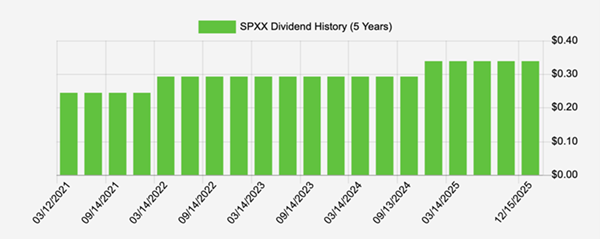 That’s a big move for a covered-call fund. Note also that SPXX didn’t fall as far as the S&P 500 during the April “tariff tantrum,” and recovered far more quickly, too.