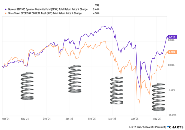 The Nuveen S&P 500 Dynamic Overwrite Fund (SPXX) sells options on 35% to 75% of its portfolio, and the premiums it collects drop straight to its 7.5% payout, which has risen 25% in the last five years.