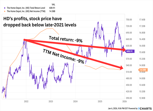 The Skinny: Home Depot (HD, 2.7% yield) is another new Dog for 2026 following an up-and-down 2025 that ultimately resulted in a nearly 10% loss for shareholders. Tariffs are partially to blame here, as are generally more cautious consumers. But we can also point the finger at a stagnant housing market (and an uncertain outlook) that’s keeping a lot of buyers on the sidelines.