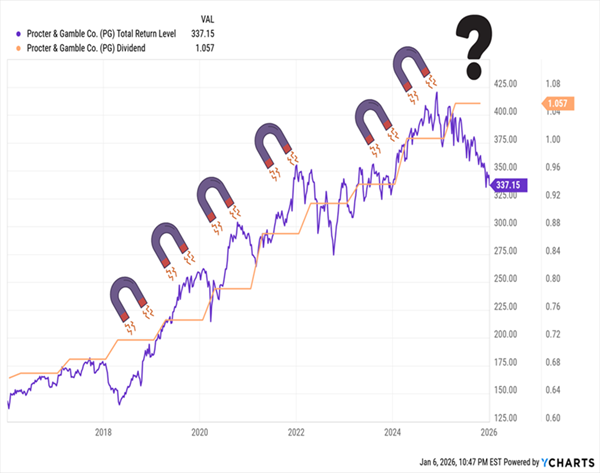 The Skinny: Procter & Gamble (PG, 3.0% yield) entered 2025 as the “last Dog in,” and even a halfway decent 2025 could have kept it off the list this year. Instead, it laid an egg, delivering a slow, steady and substantial 12%-plus loss that, on a total return basis, represented the worst year for P&G shareholders since 2008. We might expect some underperformance from defensive consumer-staples names when the market keeps setting new highs, but deep red ink? The problem for Procter & Gamble is that 2025’s bull market came despite weakening consumer spending. And while that might seem like a recipe for many staples names, P&G is premium-priced in many categories—and when the going gets tough, the tough start stocking up on Walmart (WMT) and Costco (COST) white-label products instead.