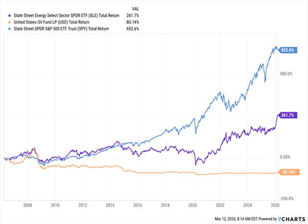 In other words, to really make money in oil, you need precise timing—on both your buys and sells. (And it doesn’t hurt to have nerves of steel, either!) To see what I mean, let’s look at the performance of the above two oil ETFs in comparison to the benchmark SPDR S&P 500 ETF Trust (SPY), in blue below: