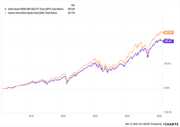 This is where closed-end funds (CEFs) come in. Take a look at the performance of a CEF called the Adams Diversified Equity Fund (ADX), in orange below. Over the last decade, this equity-focused CEF (current yield: 8.2%) has posted a total return ahead of SPY (and by extension our two oil ETFs, too):