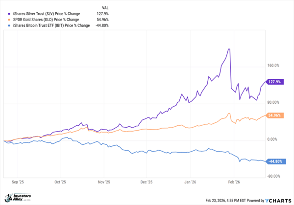It would seem that Bitcoin and other cryptocurrencies should benefit from the debasement trade; however, over the last six months, cryptocurrencies have dropped in value. I could see that, at some point, investors might start including cryptos as a move away from the dollar. However, they haven’t yet shown any signs of a sustained move higher. Here is the six-month chart of gold, silver, and Bitcoin: