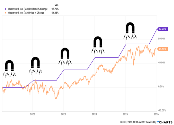 Yes, Mastercard’s 0.6% current yield is uninspiring. But dividend growth is where the party’s at. Over the last five years, MA has essentially doubled its payout, and the share price has followed along—the “Dividend Magnet” effect we’ve talked about before. And now we have a gap between the two to take advantage of.