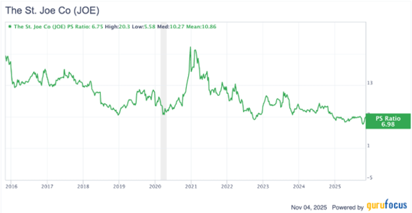 St. Joe’s price-to-sales ratio is at its lowest level in 10 years.