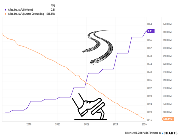 In addition, those buybacks fuel dividend growth, as they leave Aflac with fewer stocks in which it has to pay out. It’s no coincidence that Aflac’s dividend growth (in purple below) has taken off as its share count (in orange) has dropped: