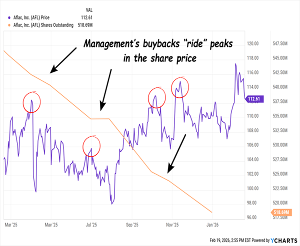 This one has another advantage we love in a market like today’s, too: Its management team “buys the dips” in the share price for us. We don’t have to do anything at all!