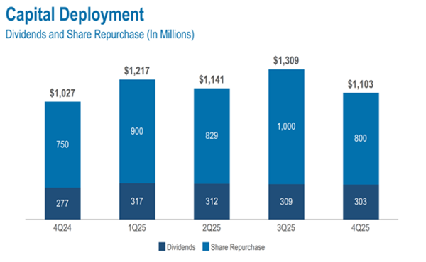 Here we see that in 2025, Aflac spent about $4.8 billion on dividends and buybacks, with a lean toward buybacks. (Which is okay by us, given the stock’s strong performance.)