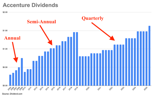 Accenture actually increased the frequency of its payments, so the dividend looks like it dropped.